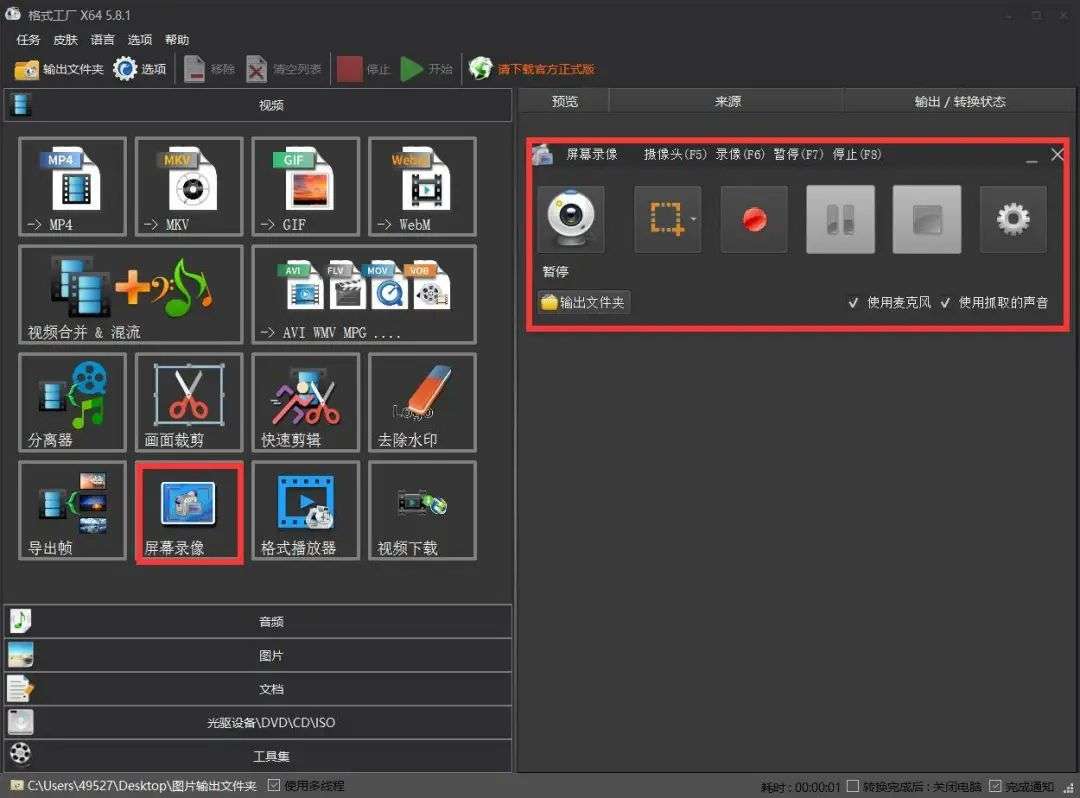 最后,《格式工厂》其实是有录屏功能的。点击视频栏中的「屏幕录像」 就会弹出录屏窗口,如果点选了「使用抓取的声音」 或「使用麦克风」 ,那么电脑以外发出的声响也能被捕捉到。