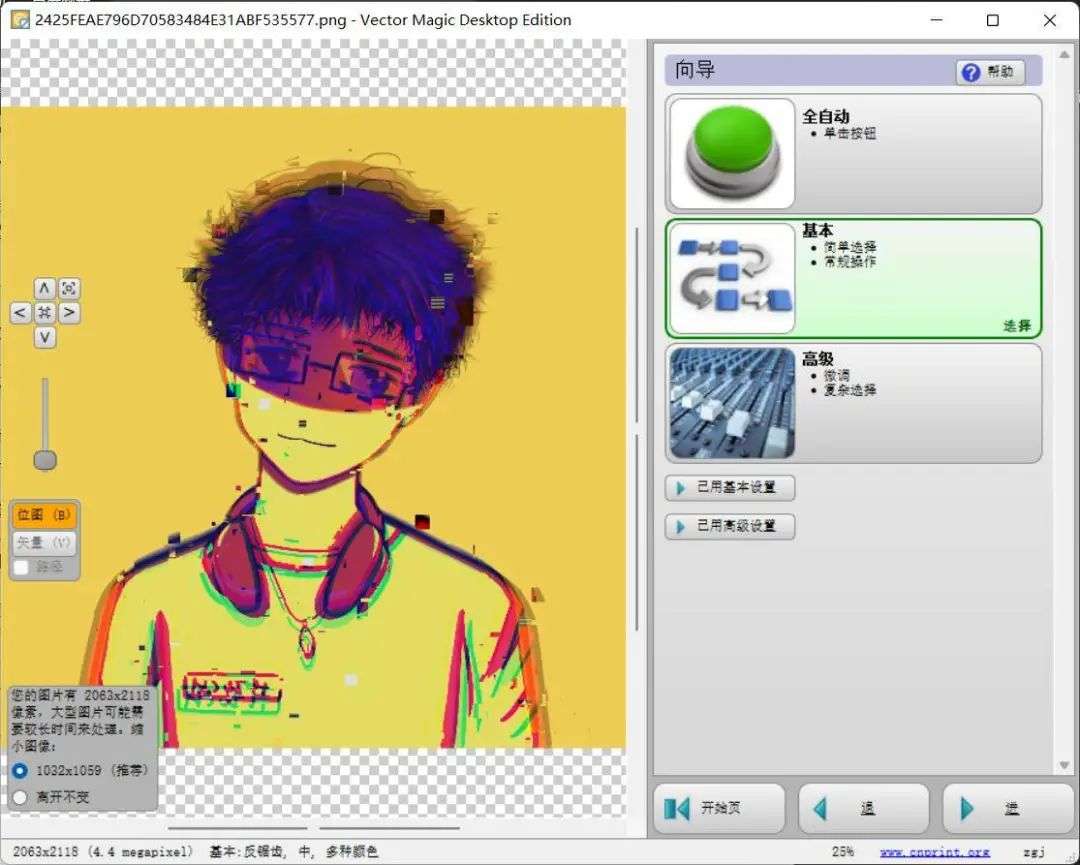 将一张画好的 JPG 格式图片导入以后,你可以选择在页面的右手边选择是进行全自动、半自动(基本)还是多参数掌控(高级)的转换。