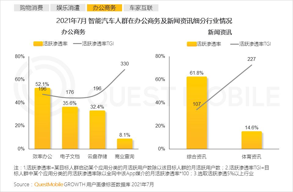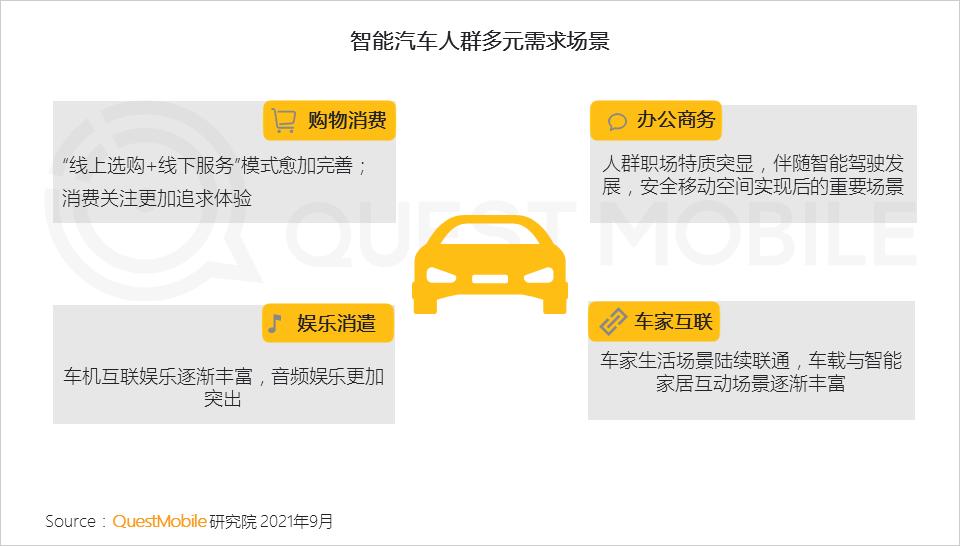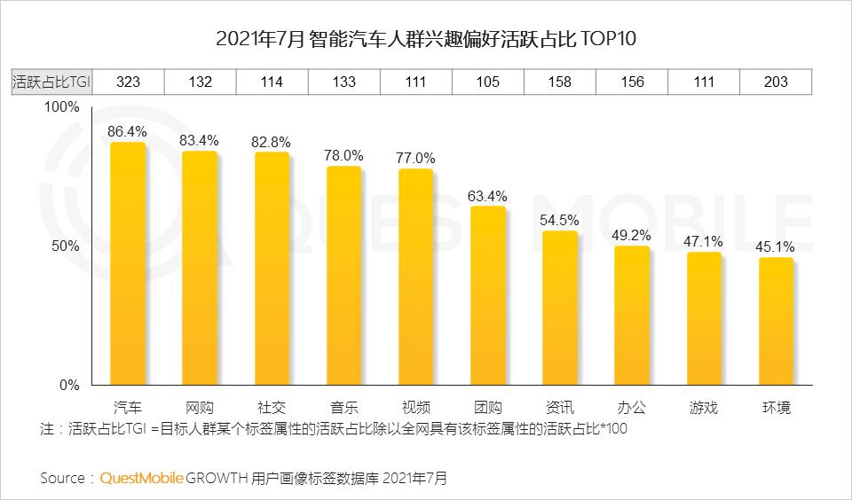 根据QuestMobile数据,2021年7月,智能汽车人群月人均使用时长331.4小时,达到有车用户时长的1.9倍。