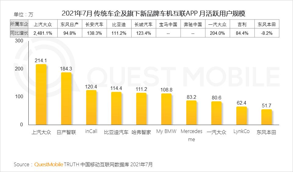 相比之下,传统车企依托存量车,带动用户使用车机互联服务,月活用户增长显著,2021年7月,上汽大众、日产智联、inCall、比亚迪汽车、哈弗智家、My BMW月活用户分别达到214.1万、184.3万、120.4万、114.4万、111.2万、108.8万……