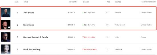另外,今年以来,马斯克与贝索斯一直在全球富豪榜上也是“你追我赶”,打得火热。今年3月,马斯克的身家一度升至1850亿美元,超越贝索斯成为全球首富。随后,亚马逊股价一路飙涨,贝索斯身家再度反超马斯克,坐稳全球首富的位置。据福布斯实时数据显示,贝索斯的最新身家为2012亿美元,领先于马斯克的1955亿美元,差距非常小。