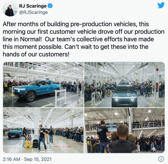 随后,Rivian便用行动回应了马斯克的质疑。9月14日,Rivian创始人兼CEO R.J. Scaringe在推特上宣布,该公司首款电动皮卡R1T已在伊利诺伊州的工厂下线。这家公司成为第一家将电动皮卡推向市场的汽车制造商,领先于其竞争对手特斯拉、通用等知名车企。