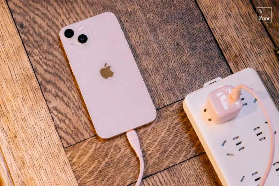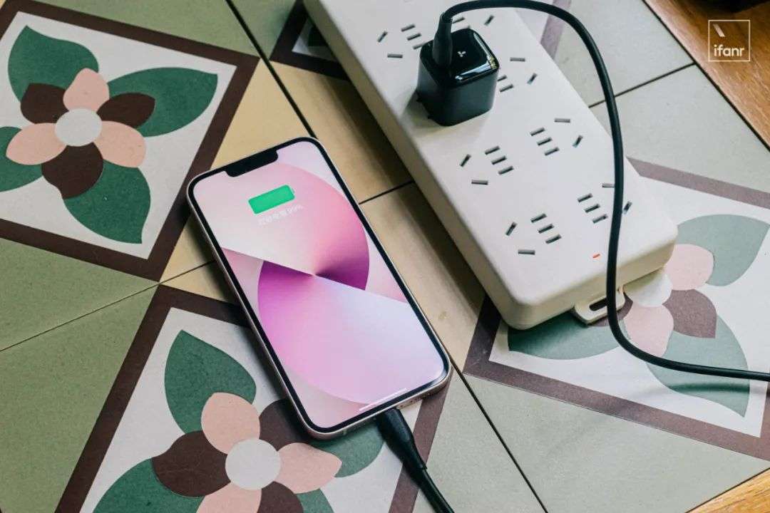 而且今年 iPhone 13 把环保主义贯彻得更为彻底,除了前文提到的新包装工艺,盒子里依然只有 iPhone 13 本体和一根 CtoL 的数据线,于是我们购入了一个图拉斯小冰块充电器来做快充测试。