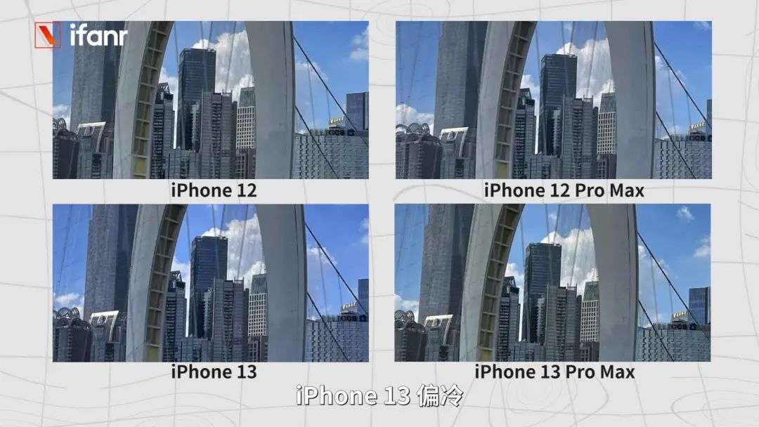 在白天,iPhone 12 和 13 之间很难找出差距。从图中可以看出,iPhone 13 偏冷,13 Pro Max 则真实许多。