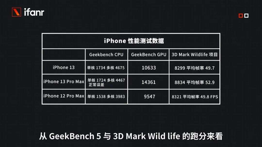 通过 GeekBench 5 与 3D Mark Wild Life 测试跑分来看,iPhone 13 与 13 Pro 的差距主要就体现在 GPU 上,CPU 表现相差无几。