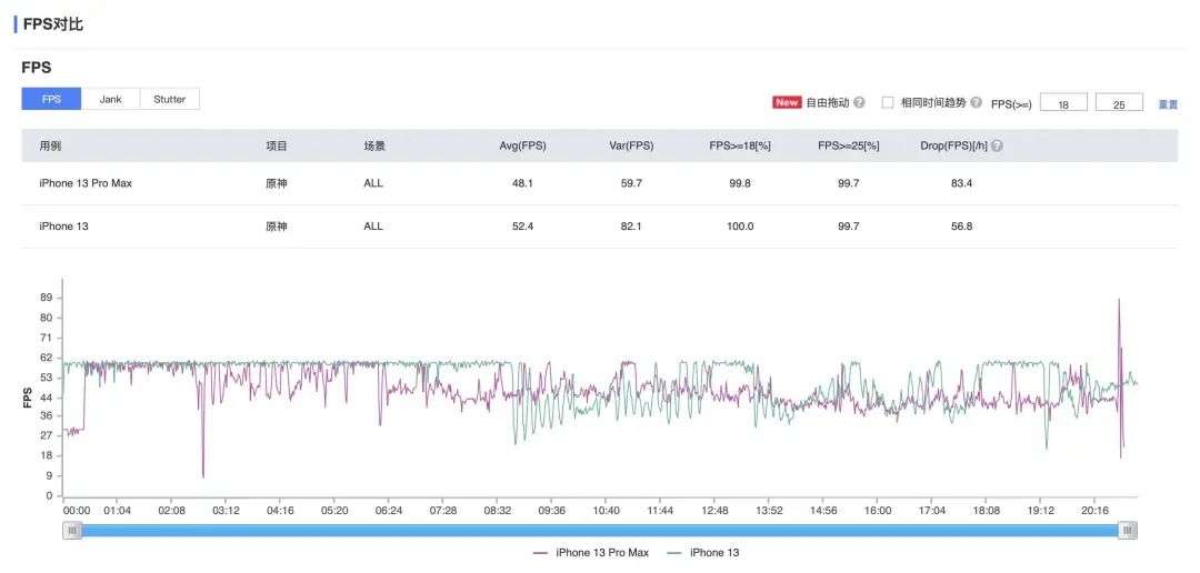 均在最高特效 60fps 帧率下进行 20 分钟游戏测试,两者前期表现差距相近,然而到了游戏中后期,iPhone 13 的帧率波动幅度比较大,而 13 Pro Max 的表现较为稳定,大部分时间都维持在 40fps 以上。