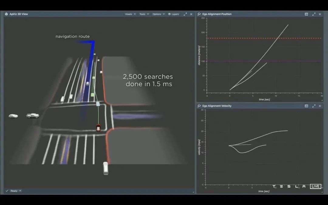 其实每当遇到这些决策的时候,特斯拉可以在 1.5 毫秒内做出 2,500 次推演。相比人脑,这种场景对于电脑来说,其实都是静止的。