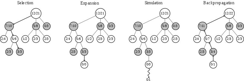 反向传播(Backpropagation):使用随机游戏的结果,更新从C到R的路径上的节点信息。
