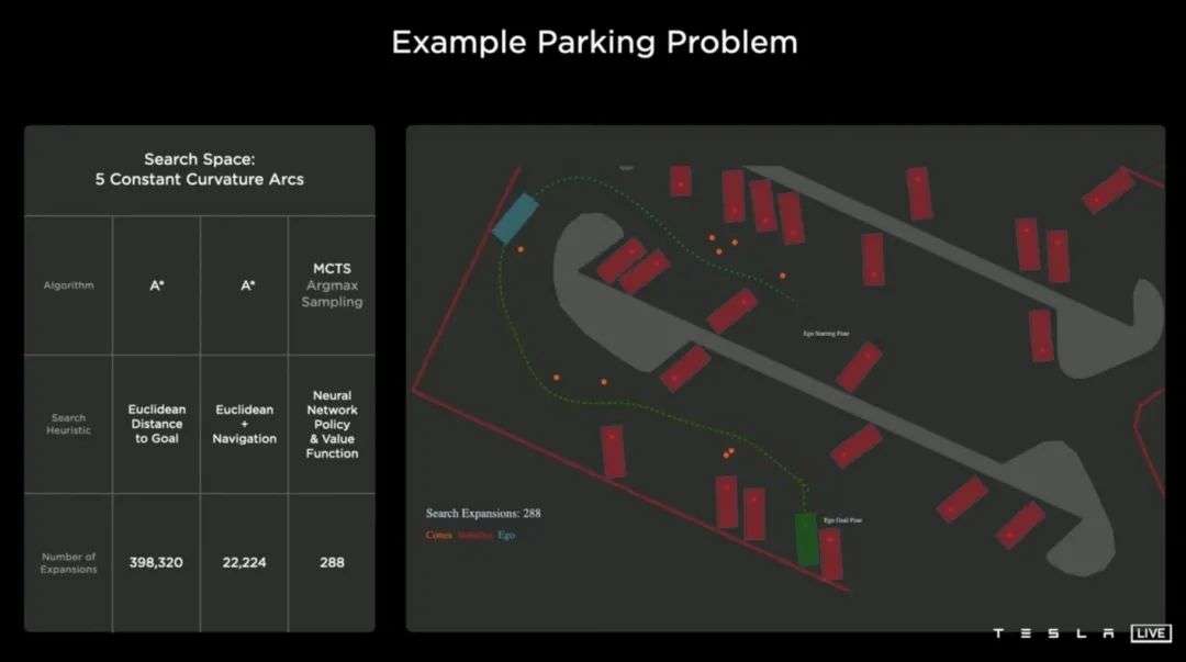 Elluswamy 表示,他们分别对比了 A* 搜索(欧几里得距离算法)、基于欧几里得距离算法+语义导航信息导航的 A* 搜索和基于神经元网络策略+价值方程的蒙特卡洛树搜索。