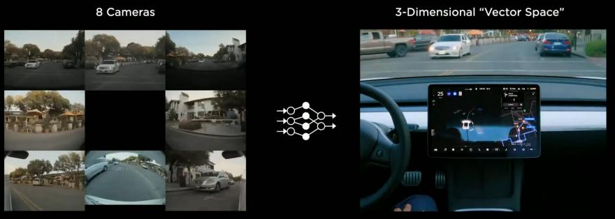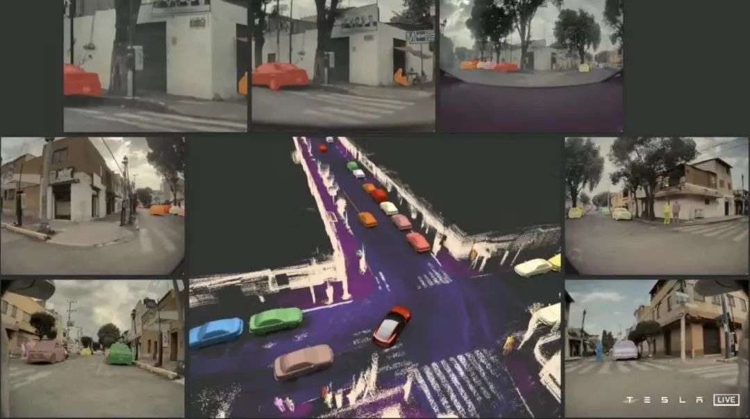 想必大部分的朋友们已经知道,特斯拉现在采用的是纯视觉感知方案。只依靠 8 个 130 万像素摄像头的感知能力,确实提升到了一个新的境界。传统的感知算法是把这 8 个摄像头的里的每一帧图片中的相关物体逐个画上边框,来评估距离信息并依此输出规控结果。