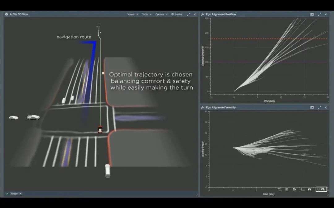 上图中,车辆需要在下一个路口左转前完成两次连续的向左变道。如果选择插入到相近的两台车之间,急促的刹车不可避免。但是如果为了避免车辆而加速到最前方,又会面临错过路口的风险。FSD 可以从图里的右侧的多个解答(每一根线都对应不同的动作指令)中选择加速度(和舒适性有关)较为稳定且路径(和效率有关)较短的结果来执行。