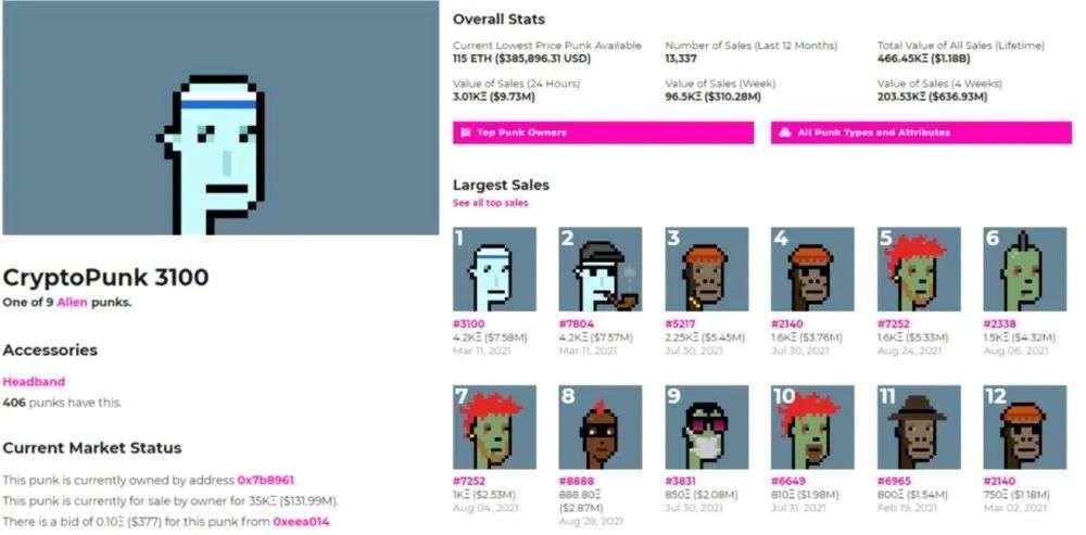 根据Cryptoslam统计,目前销售额最高的三个NFT项目分别是区块链游戏Axie Infinity、NBA球员卡收藏品NBA Top Shot和虚拟形象收藏品Cryptopunk,销售额分别达到10.4亿美元、6.7亿美元和6.5亿美元。