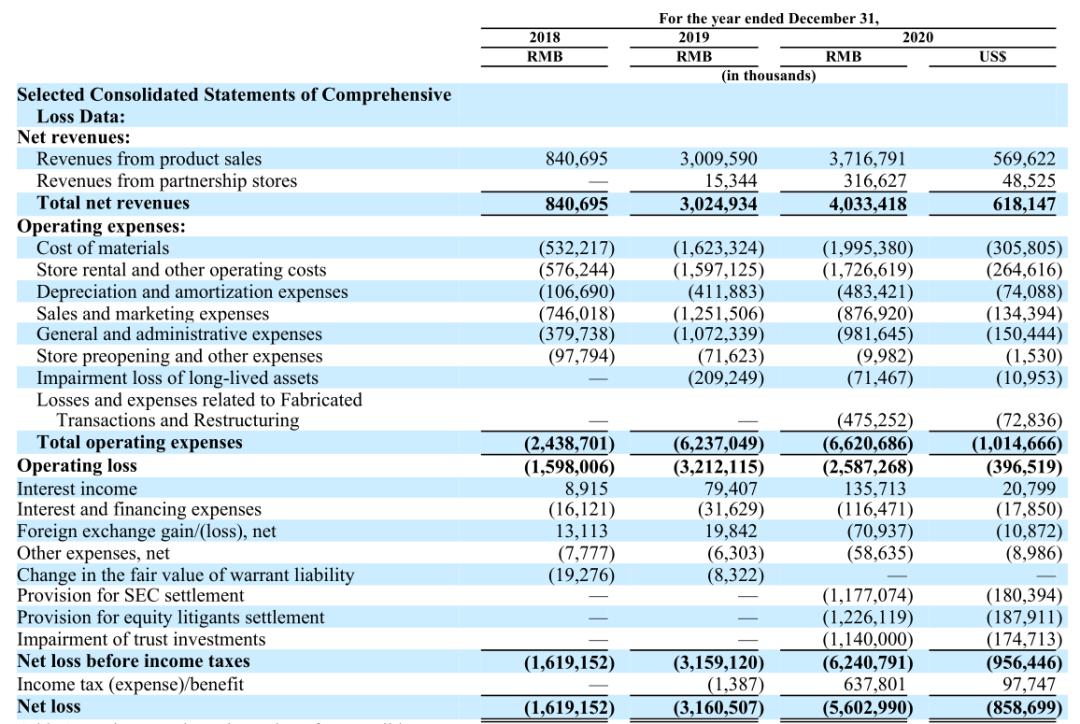 虽然业绩处于逐渐回血的阶段,但是由于支付和解金额、信托投资减值的影响,瑞幸在2020净亏损仍高达56.03亿元,较2019年净亏31.61亿元进一步扩大。