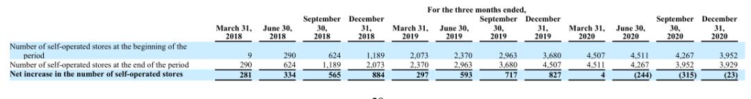 从门店规模来看,瑞幸的自营店仍处于收缩状态。2020年底,瑞幸拥有3929家自营店,其中处在关店潮的Q2减少244家,Q3减少315家,整体较2019年的4507家减少了578家。不过开放加盟的合作店扩张较快,去年净开592家。