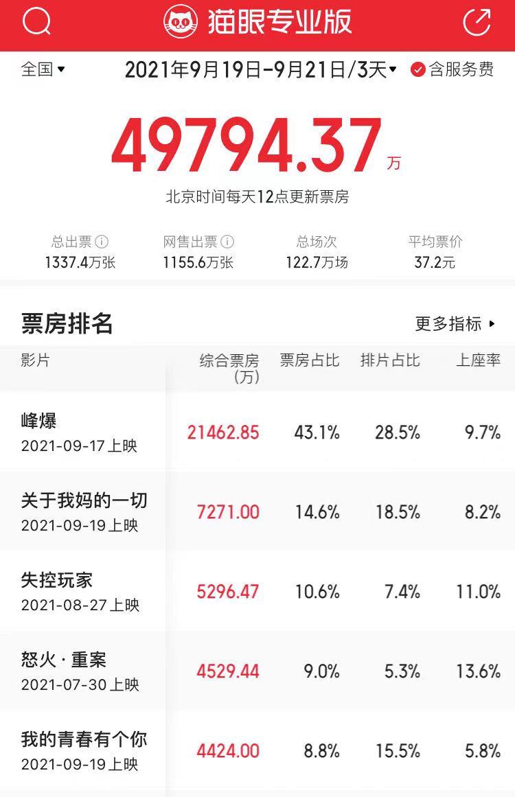 但现实里,《峰爆》在票房市场上一直强压《关于我妈》一头。《关于我妈》中秋档上映3天,累计票房达到7271万元,排片维持在18%左右,同时段内,《峰爆》累计票房2.15亿元,排片占比达到28.5%。显然中秋档里《峰爆》是一家独大。
