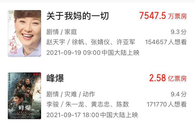 这其中,《关于我妈的一切》(以下简称《关于我妈》)是一个典型。《关于我妈》一直被认为是中秋档唯二的种子选手,另一个种子选手是9月17日率先抢跑的主旋律灾难片《峰爆》。在两部电影正式上映前,有业内人士预测,《峰爆》提前收割票房,而《关于我妈》有可能凭借亲情题材完成情绪共鸣,后发优势加上档期效应,成为黑马,实现票房赶超。
