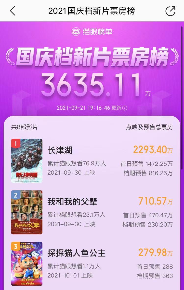 中秋档中头部电影公司参与程度并不深,大家都将大片留在了国庆。目前国庆档汇集了《长津湖》《我和我的父辈》《十年一品温如言》《五个扑水的少年》等12部电影,博纳影业、光线传媒、万达影视等均有电影输出。