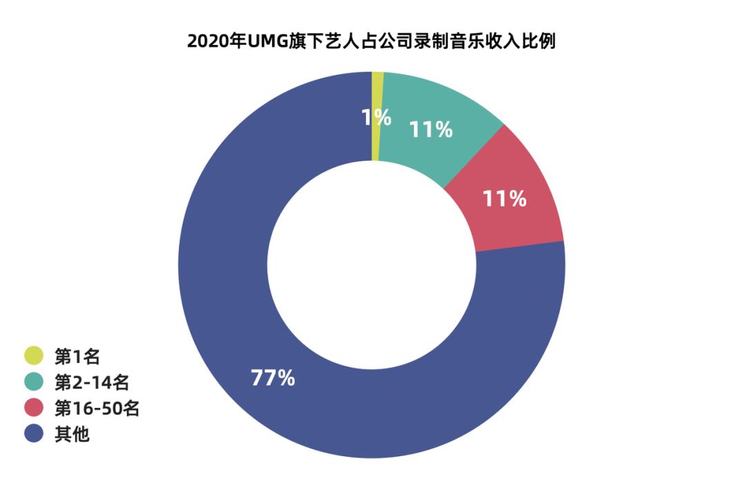 尽管如此,根据最近披露的招股书显示,UMG的收入对个别或头部艺人群体的依赖性并不强。2020年环球音乐来自录制音乐板块的营收里,没有任何一位艺人带来的收入比重超过1%,公司Top50的艺人一共在营收占比中也仅占23%。