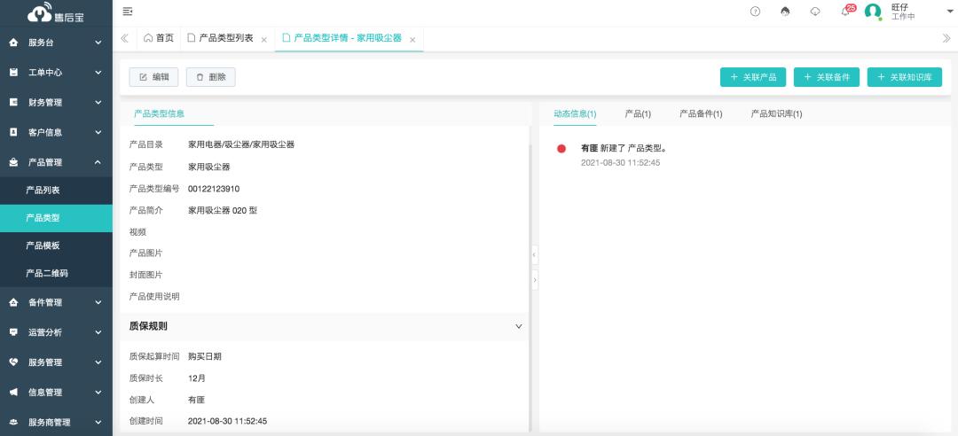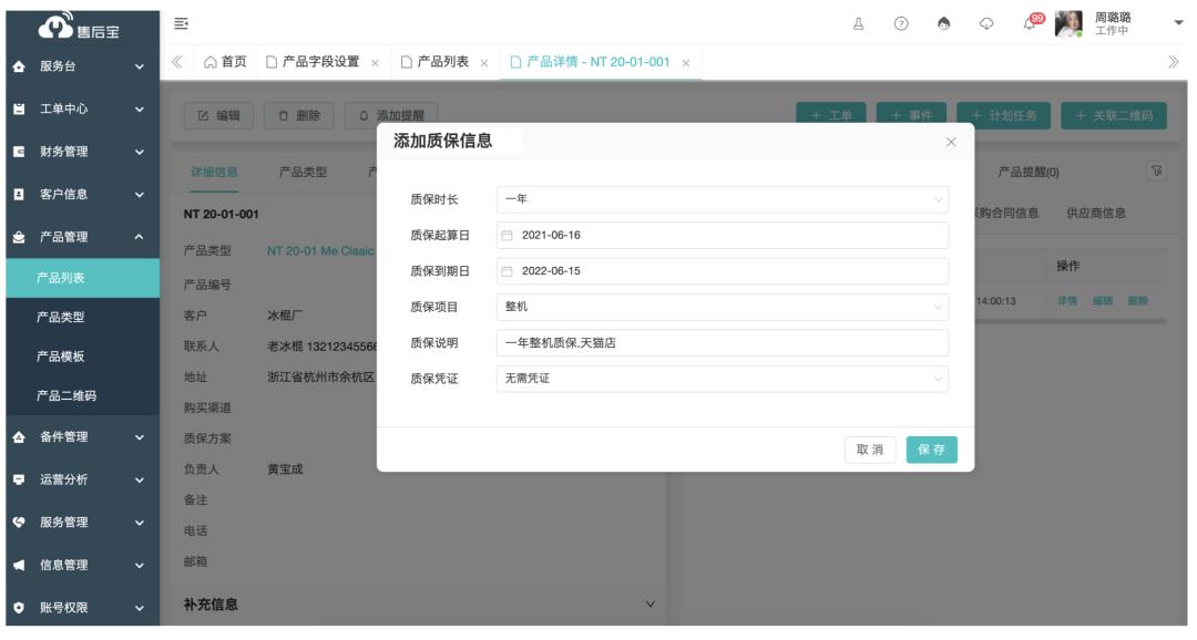 保存质保类型后,可在产品类型列表中或与之后的关联工单中,看到质保信息,帮助售后部门在备件与服务费用结算。