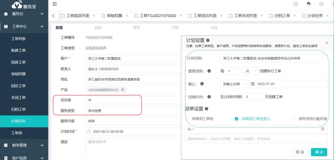 安科依据服务合同需要定期巡检、进行维护保养计划,为防止漏单与延误,安科在售后宝平台建立计划任务,并可设置提醒功能。