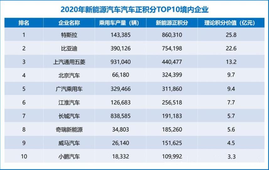 根据工信部数据,2020年国内新能源汽车正积分TOP10分别为,特斯拉、比亚迪、上汽五菱、北京汽车、广汽乘用车、江淮汽车、长城汽车、奇瑞新能源汽车、威马汽车和小鹏汽车。