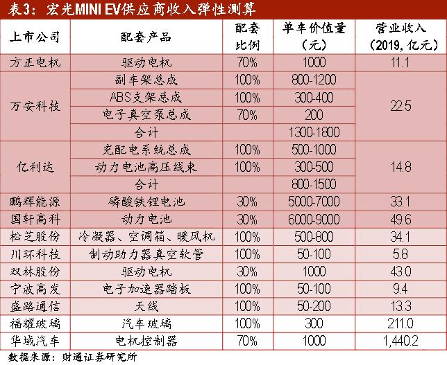 根据财通证券对宏光MINIEV的对零件价格整理,一辆宏光MINIEV被造出至少需要12家上市公司和15款零件供应。