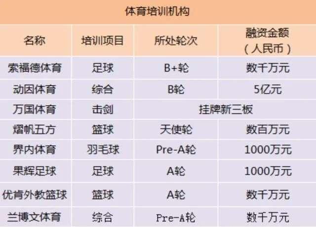 场馆租赁、赛事运营、青少年多项目培训为一体的动因体育2017年获得5亿元B轮融资,算是早期行业内领先者。