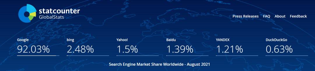 以「To organize the world's information and make it universally accessible and useful」(整合全球信息,供大众使用,使人人受益)为宗旨,背靠复杂的算法,借助准确的搜索结果为基石,Google 搜索引擎已成为全球最受欢迎和信任的搜索引擎,其比位于第二名 bing 足足高出近 90% 的市场份额。