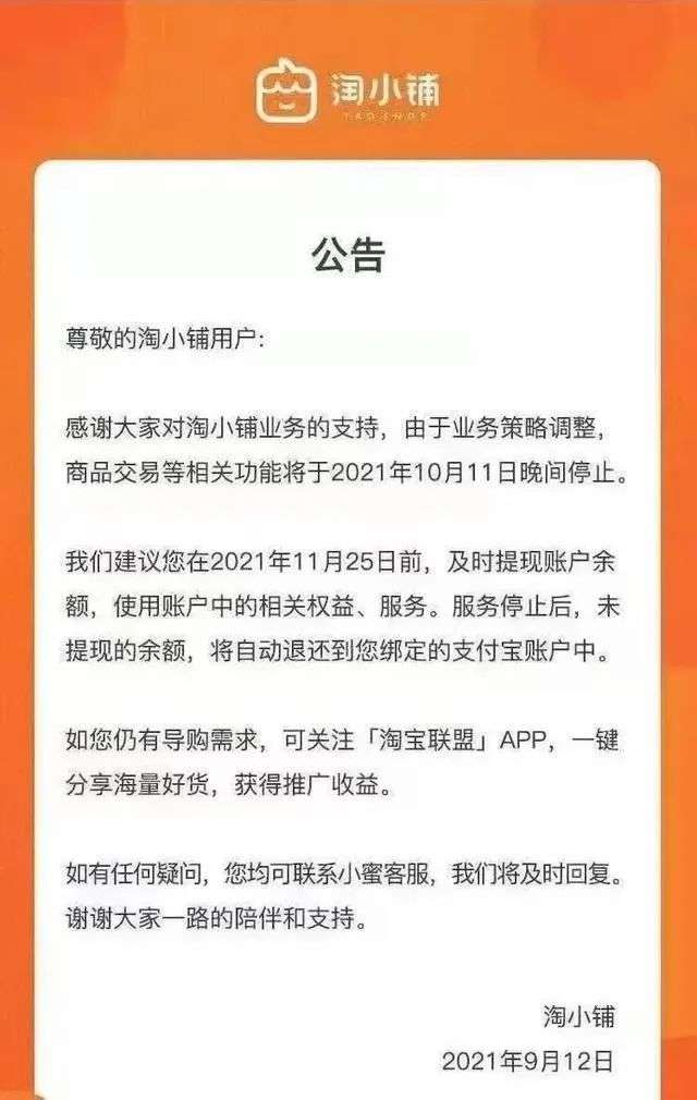 李早看到的截图,是一张关于淘小铺的停服公告。2021年9月12日,淘小铺发布公告称,由于业务策略调整,平台的商品交易等相关功能将于2021年10月11日晚间停止。
