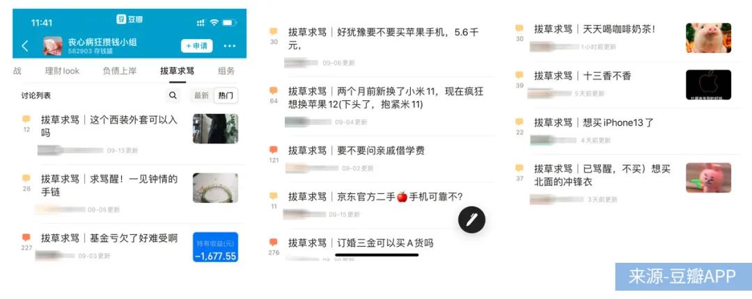 “拔草求骂”板块是攒钱小组里一道独特风景。在对花花世界的“物欲”抵抗无力时,组员们会发帖带上自己将要“沦陷”的商品,求伙伴们理智评判,以免冲动消费。