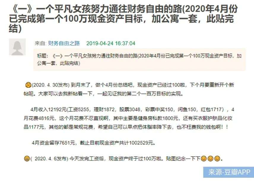在帖子的评论中,她鼓励“存钱罐”们:“我从小家庭条件一般,工作后父母没有给过我一分钱的资助,我今天所有的这一切都是拼命攒钱的结果……想告诉和我一样的四线小城市女生,我们也可以的,一百万也是可以做到的!”