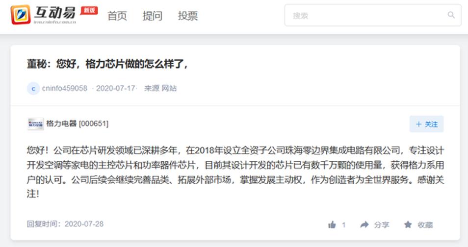 在研发上,格力已小有成绩。去年年报显示,公司自研的芯片已经得到量产验证,累计申请专利629件,格力给用户的回复里,也表示自己开发的芯片已有数千万颗使用量。