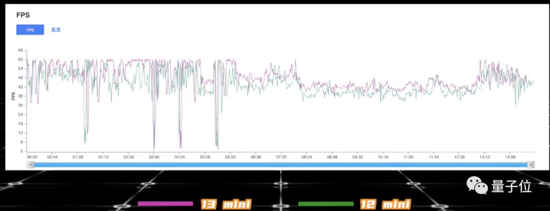 其中,13 Pro Max在降频到50帧率左右后后期还能回复;13在帧率稳定40和稳定50之间反复横跳;13 Mini则在降到40帧之后不再波动直接开摆。