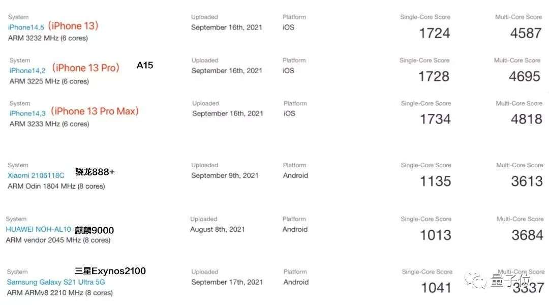 而安卓阵营的顶流芯片们在跑分结果上也确实比不过A15: