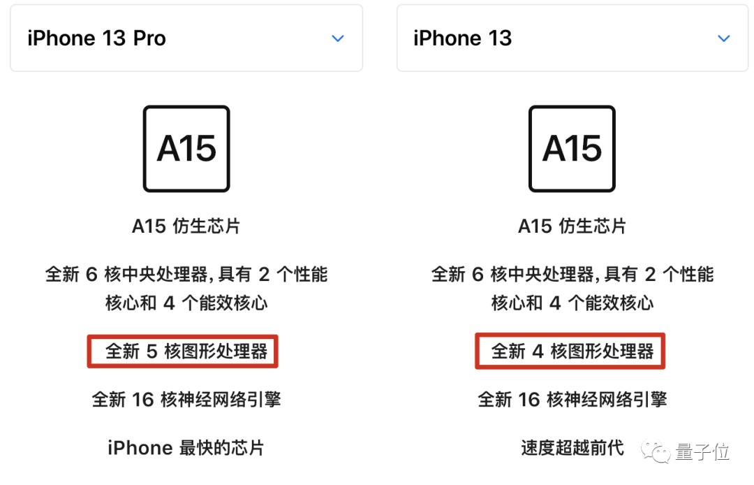 iPhone四个产品线,Pro和Pro Max上的A15有5个GPU核心,普通13和Mini上只有四个。