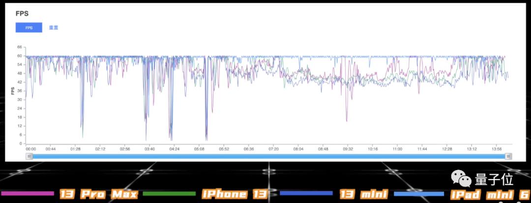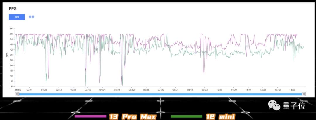 但在后半程跑图的平均帧率上,13和13 Mini在40上下波动,13 Pro Max则维持在40到50之间,并且能短暂恢复到60帧: