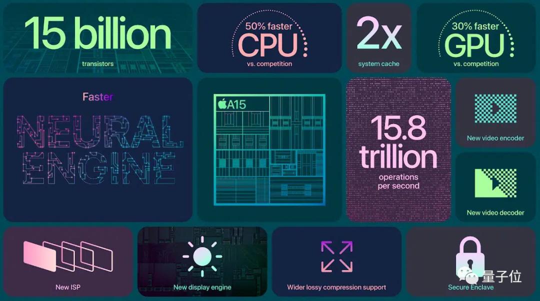 然后是晶体管数量,A15集成了150亿个晶体管,比上代A14是118亿。