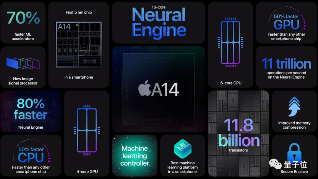 A14时神经引擎从8核升到16核放在海报上方正中间醒目位置,速度还快了80%。