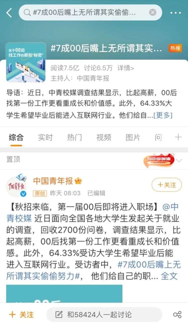 近日,中青校媒一则调查结果显示,比起高薪,00后找第一份工作更看重成长和价值感。