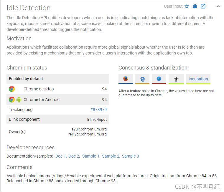 关于 Chrome 94 稳定版的更多功能介绍,大家可以前往:https://www.chromestatus.com/features/5680057076940800 查看。接下来我们来谈谈分歧跟争议比较多的 Idle Detection API 功能。
