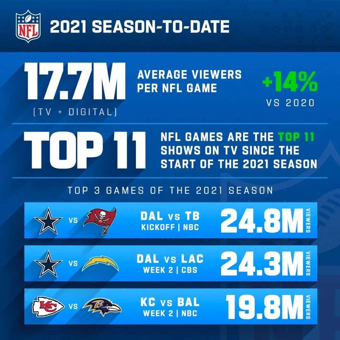 精彩的比赛,自然也能够带动收视率的激增。根据官方披露的数据,NFL头两周赛事平均收视人数达到1770万人次,比去年同期增长14%;而美国本季度收视率最高的11档电视节目均来自NFL比赛,牛仔与海盗的新赛季揭幕战平均收视人数更是高达2430万人次。在休赛季刚刚签下惊人1130亿美元转播合同的NFL,无疑再一次证明了自己冠绝全球体育市场的商业价值。