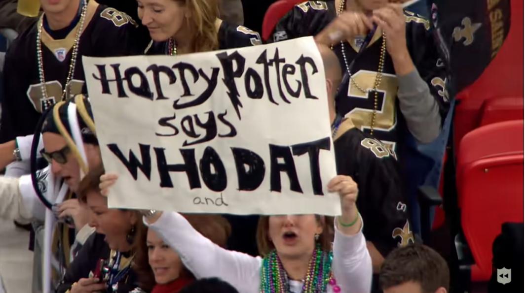 伦敦赛的哈利·波特迷举起新奥尔良圣徒口号横幅