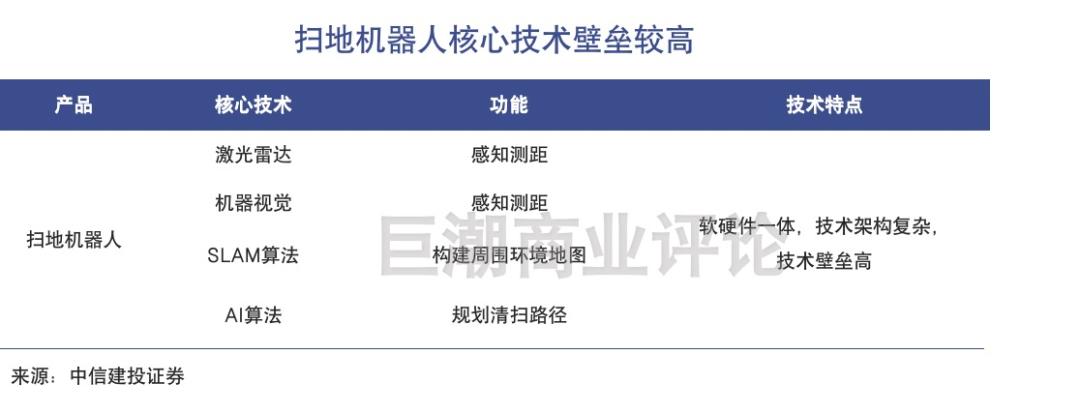 虽然国内扫地机器人ODM、OEM厂商的制造能力已经比较成熟,也有不少厂商提供专门的集成方案,使得外部玩家进入的难度大大降低,但高端的扫地机器人所需要的激光雷达、机器视觉、SLAM算法等核心技术人仍然有着较高的壁垒。