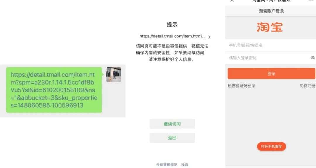 只不过,过往从淘宝分享某商品到微信,我们必须复制一段乱码发给好友,且好友收到后还无法在微信直接打开,需繁琐地再复制它、打开淘宝APP,才能实现切换。而如今微信“逐步开放”后,人们可能再不用被这繁琐操作困扰了。