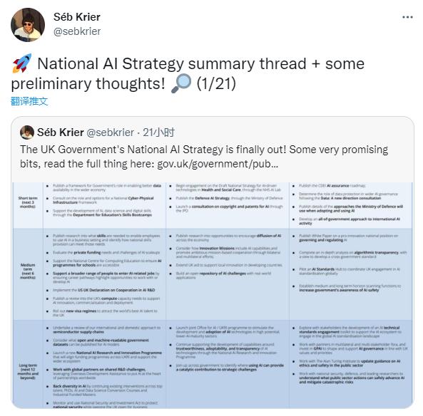 斯坦福网络研究中心的高级政策研究员 Seb Krier 通过 Twitter 表示,国家人工智能战略的一些内容是“非常有前途”的,而 DeepMind 首席运营官Lila Ibrahim 表示很高兴看到明确关注对人工智能的有效治理,赢得公众和企业对AI的信任至关重要。