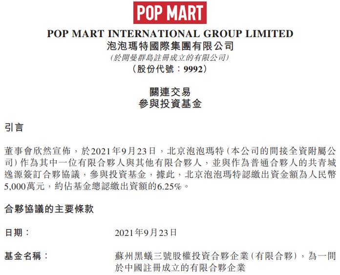泡泡玛特9月23日发布公告称,北京泡泡玛特(本公司的间接全资附属公司)作为其中一位有限合伙人与其他有限合伙人,并与作为普通合伙人的共青城逸源签订合伙协议,参与投资基金,据此,北京泡泡玛特认缴出资金额为人民币 5000万元,约占基金总认缴出资额的6.25%。