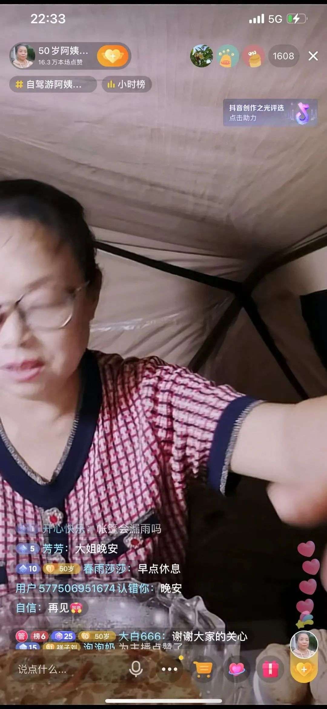 直播前,苏敏画了眉毛,为了显得精神,还涂了口红。在车顶帐篷里,她架好直播手机,面前放着中午吃剩的酸菜鱼,苏敏一边介绍产品,一边吃着鱼。有时说话着急了,酸菜鱼的辣味呛得她直咳嗽。