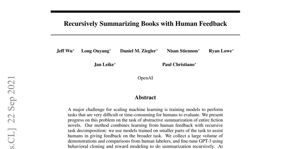 以往,大型训练模型并不善于总结文本。此前,团队发现从人类反馈中训练强化学习模型,有助于使模型变得善解人意。简单说,就是由人来判断模型输出结果,以帮助模型进化,从而理解短帖和文章中人的情感和表达的含义。当任务扩展到整本书,摘要工作对模型来说变得更难。