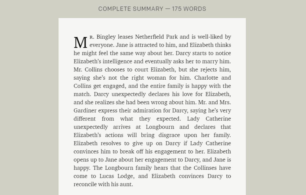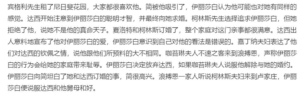 看完AI对短篇文学作品的梗概,我们再来看看中长篇,比如简·奥斯汀12万词的《傲慢与偏见》,摘要是这样的: