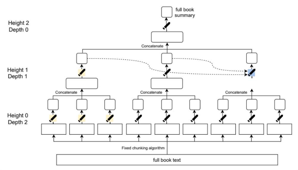 直到最后,一段136词的梗概才呈现出来。这一梗概生成的过程可以从以下模式图中展现,该方法可用于对任意长度的书进行总结,实现了在数十万字的书籍上递归到3层深度的内容总结。